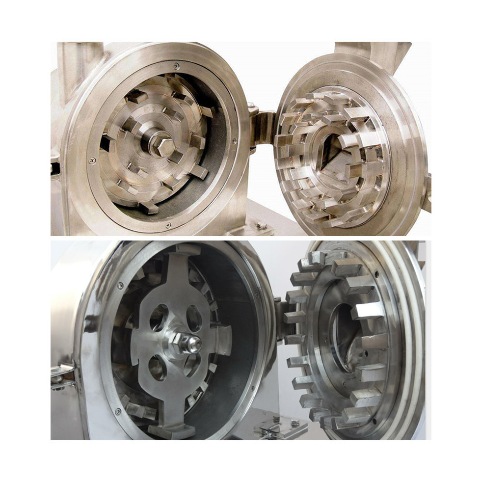 Het maakt gebruik van de hoge snelheids relatieve motie tussen de beweegbare toestelschijf en de staand vistuigschijf, het materiaal kan door tandeffect, wrijving en effect tussen de materialen worden verpletterd. Het verpletterde materiaal is automatisch ingegaan in de opsluitende zak door de actie van roterende middelpuntvliedende kracht, en het stof wordt gefiltreerd en door de vacuümdoos door de doekzak teruggekregen. Het stof van de doekzak in wordt het concentrerende geval verzameld in het geval van de stofabsorptie. De machine wordt ontworpen volgens GMP norm.