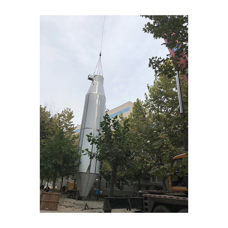 De vloeibare grondstof wordt ingevoerd door hoge drukpomp, aan slanke waterdalingen geatomiseerd en bespoten, dan integreert het met hete lucht en valt neer. De meerderheid van poederkorrel wordt bijeengezocht uit afzet van lossing bij de bodem van materiaal. De verspilde lucht en het fijne poeder zijn gescheiden door cycloon, is de verspilde lucht uitlaat van trekkingsventilator, en het fijne poeder wordt verzameld bij de bodem van cycloon. Bij de afzet, is er een uitgerust diodestofdoek; daarom houdt de gebeëindigde de inzamelingsverhouding van de poederkorrel op hoog niveau tussen 96% aan 98%.